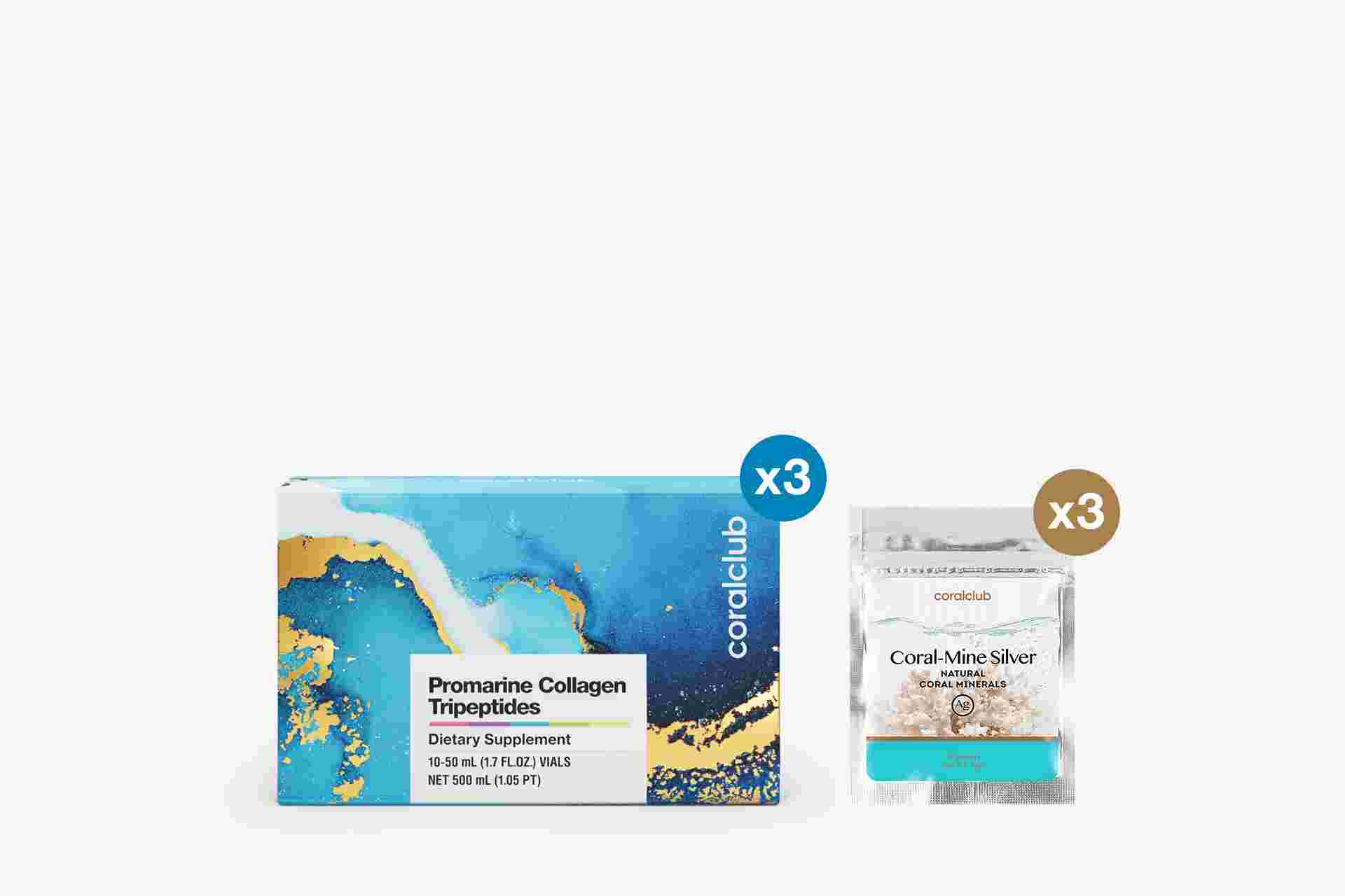 Promarine Collagen Tripeptides (3 packs of 10 bottles (1.7 fl.oz/50 ml): Hydrolyzed Fish Collagen Liquid (incl. Maxicollagen 3.5 g) 15 g, Hibiscus Sabdariffa Flower Extract 1.5 g, White Currant Extract (Ribes Rubrum) 700 mg, Vitamin C (Ascorbic Acid) 100 mg, Hyaluronic Acid (Sodium Hyaluronate) 72 mg, Vitamin B6 1.8 mg, Vitamin B2 1.7 mg, Spinach 1 mg, Biotin 50 mcg. Coral-Mine (3 sachets of 10 sachets): Ground Coral, L- ascorbic Acid